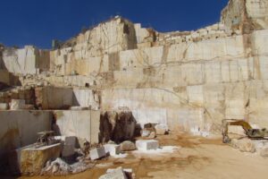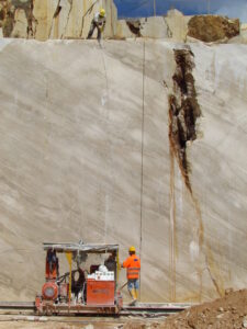 Covering some 6 hectares (15 acres), the In.Pro.Mar. quarry is the largest and produces all the varieties of Daino: Nuvolato, Perlato and Fiocco di Neve. Given quarry size, the marble can be extracted from several fronts at the same time, ensuring constant supply. Here extraction work is under development and is being done on the first quarry levels, demonstrating not only the extent of the marble’s availability but also guaranteeing future production. The In.Ma.Sa. quarry instead covers about 4 hectares (10 acres) and at present is the most productive. Work is done simultaneously on 10 to 11 fronts and produces about 200 blocks per month, again in all the types of Daino: Venato, Nuvolato, Perlato and Fiocco di Neve.